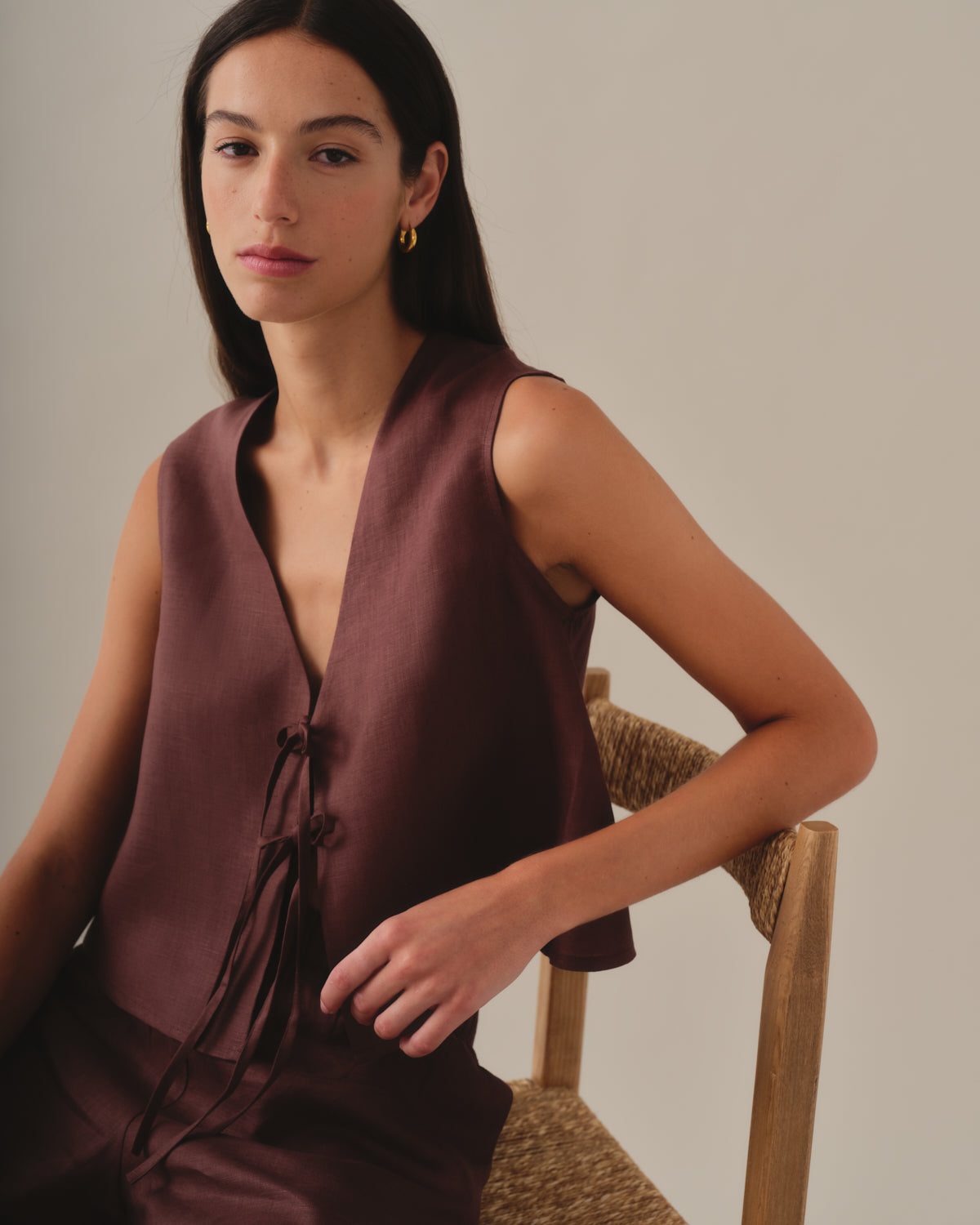 The Rita Blouse is a sleeveless brown linen top with a deep V-neckline. It features an open front design with two delicate self-tie closures, adding a stylish and adjustable touch. The fabric appears lightweight and breathable, perfect for warm weather. The top has a slightly cropped and relaxed fit, making it ideal for pairing with high-waisted pants or skirts for a chic, effortless look.