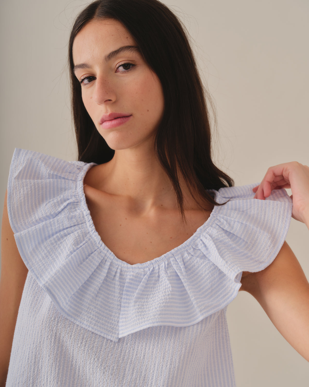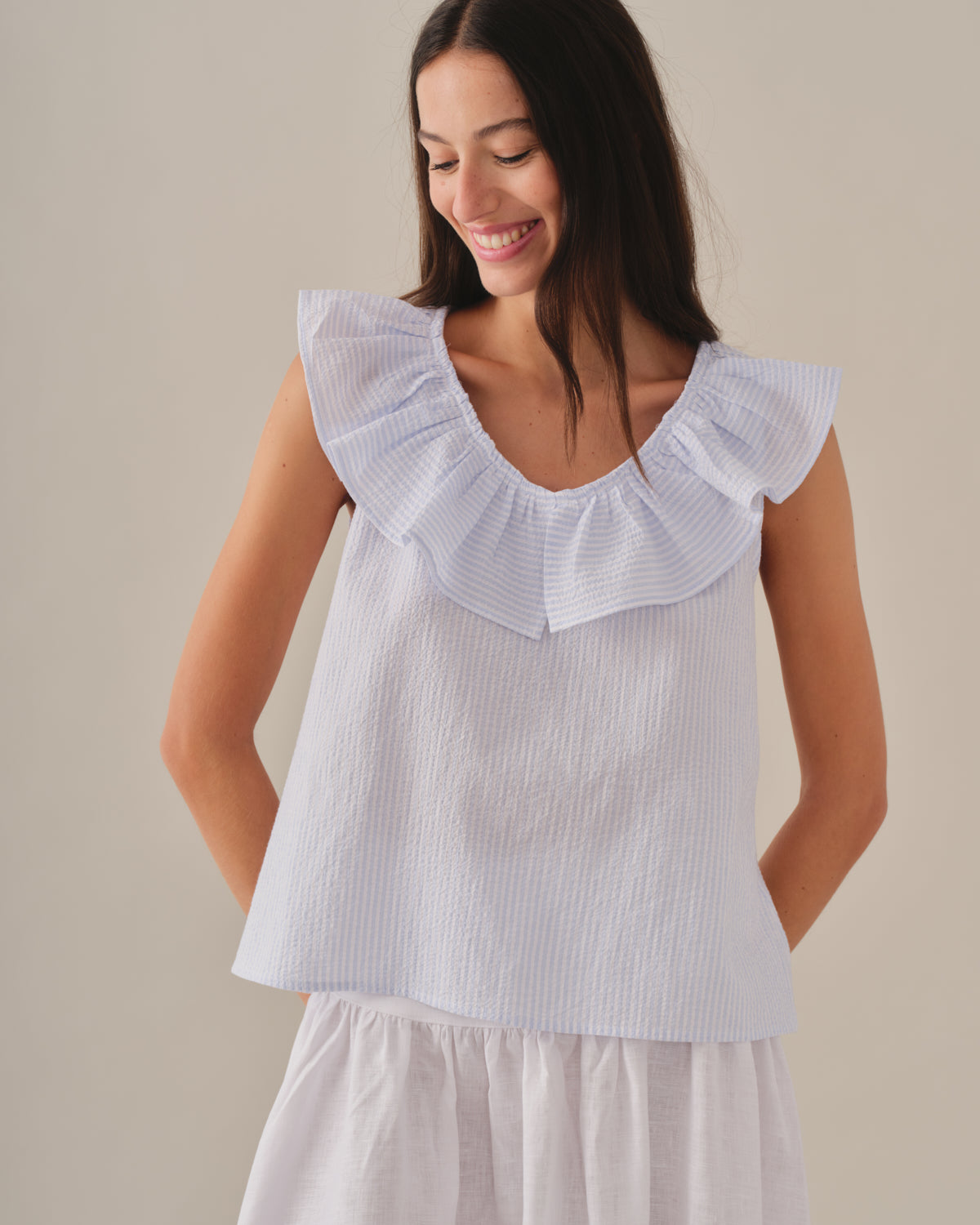 The Elle Blouse is a sleeveless top with a flattering V-neckline adorned with a bold ruffle detail. Designed with a loose, straight fit, it gently falls just above the hips, offering a chic, relaxed silhouette perfect for a summer day.