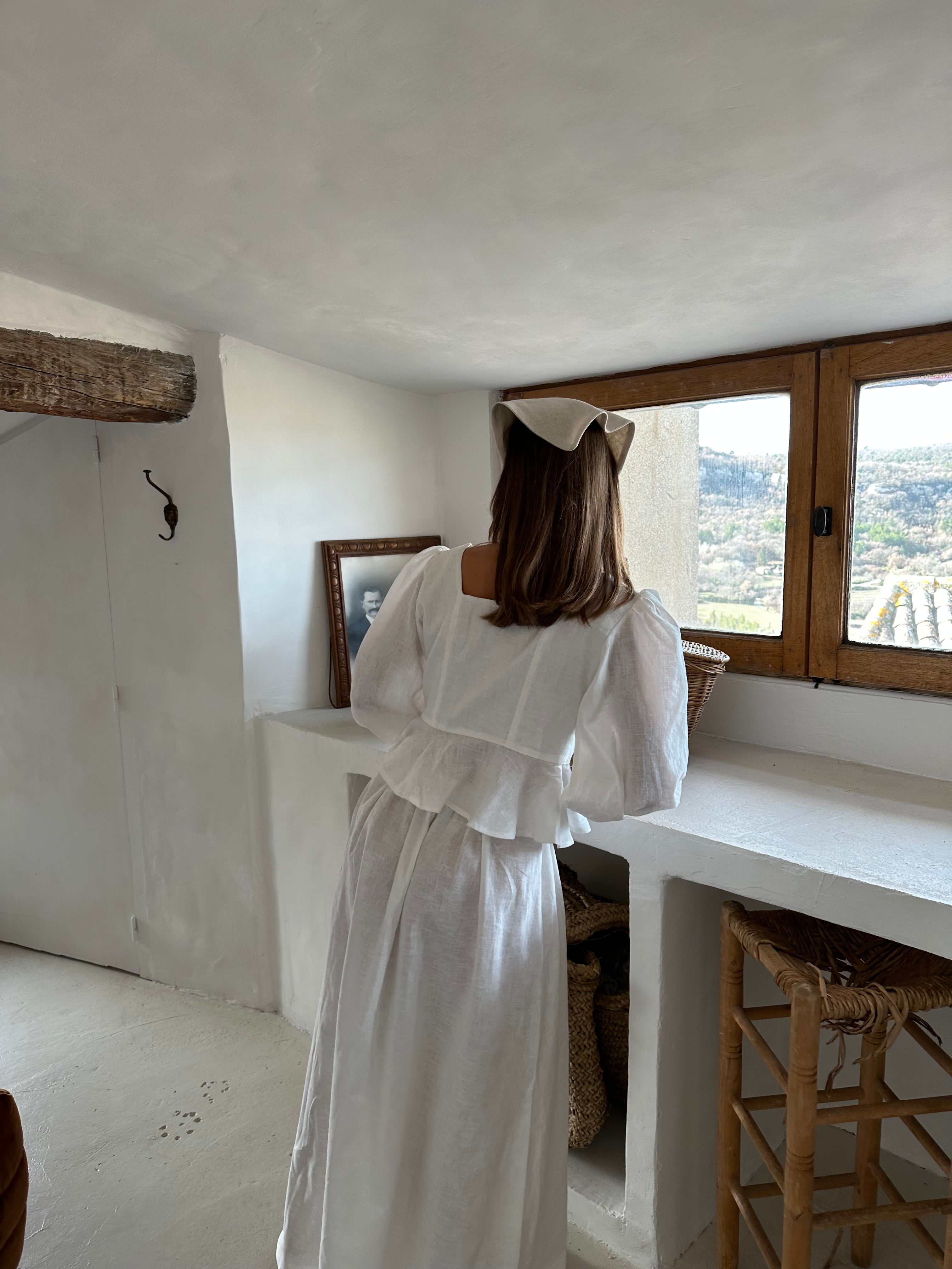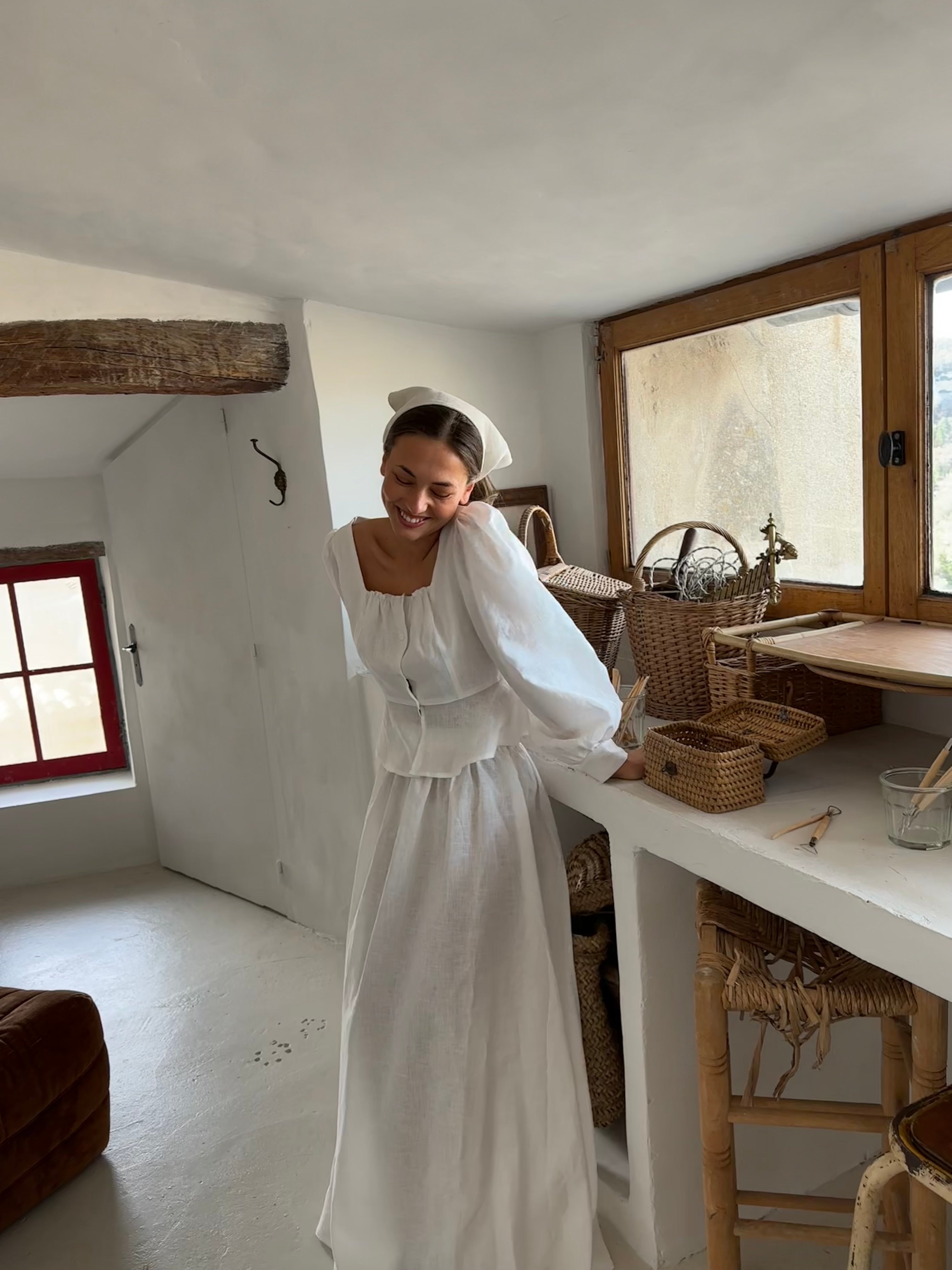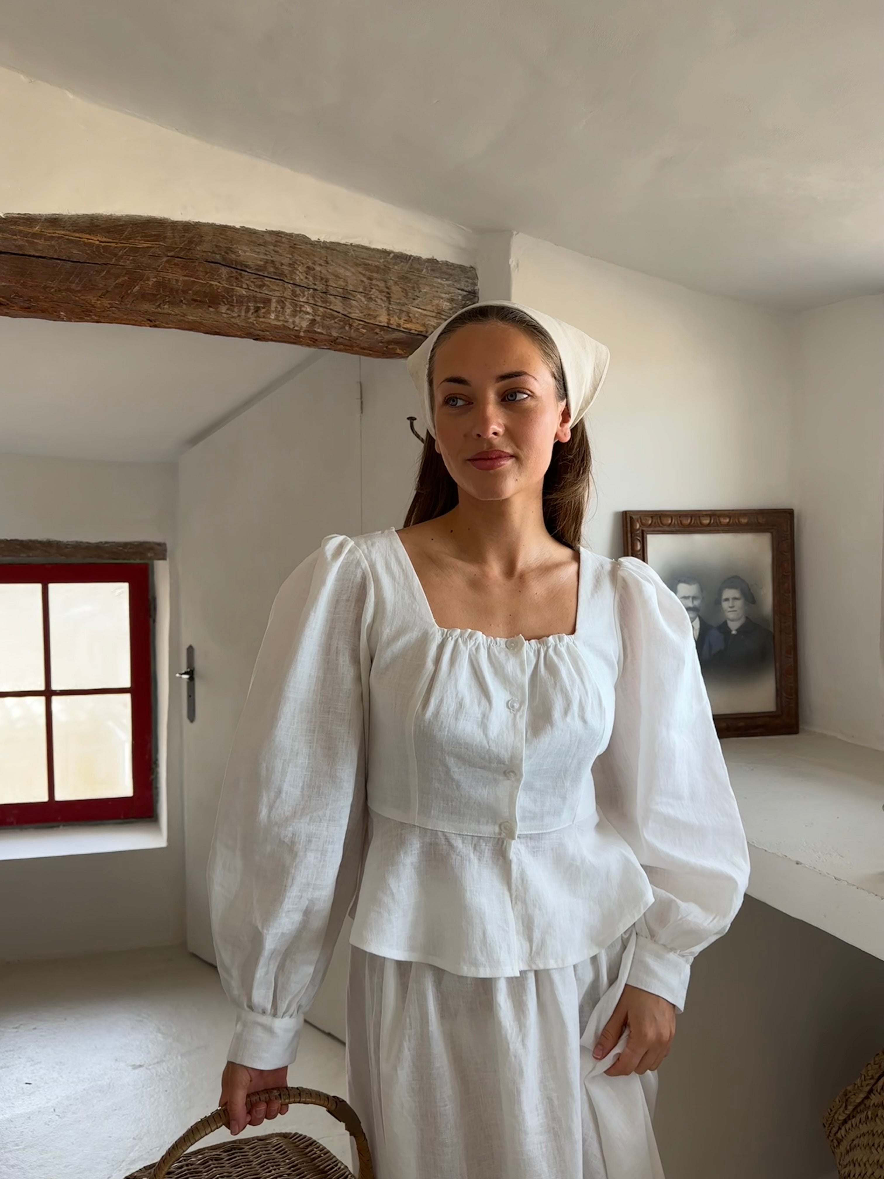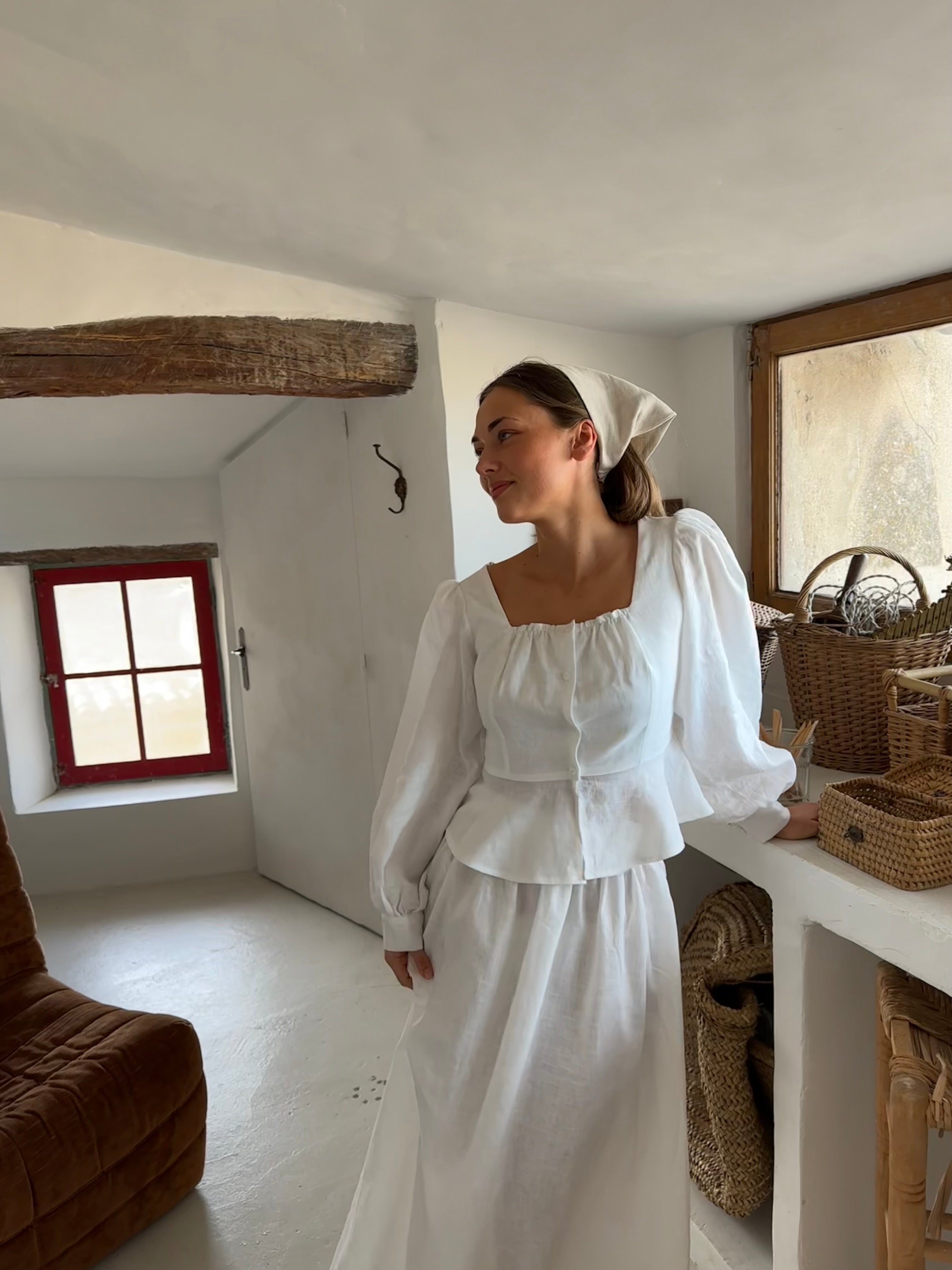 ~Fabricado en 100% lino. ~Silueta ajustada que recuerda sutilmente a un corsé. ~Mangas largas tipo globo con puños. ~Presenta un escote cuadrado con delicados detalles de volantes. ~Se ajusta al tamaño real. ~Nuestra modelo lleva una talla S.