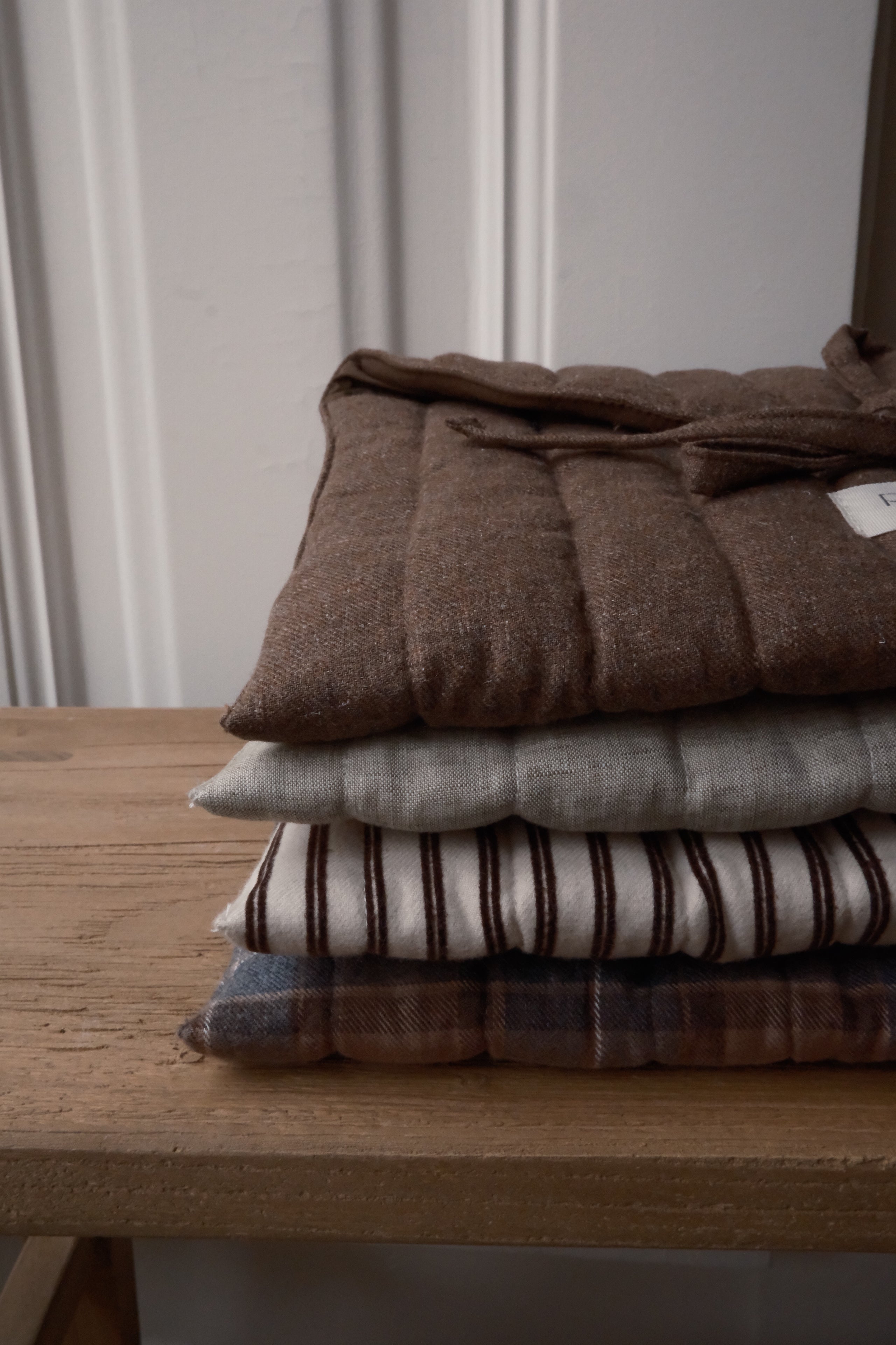 Fabric: ~* Cocoa Chocolate 55% Linen, 45% cotton - Lining 100% Cotton ~* Striped Brown 100%Cotton - Lining 100% Cotton ~* Striped White 100%Cotton - Lining 100% Cotton ~* Striped White and Baby Blue 100%Cotton - Lining 100% Cotton ~* Stone Beige 100%Linen - Lining 100% Cotton ~* Plaid Brow 100%Cotton - Lining 100% Cotton ~Care Instructions: ~In order to ensure they will last for their maximum lifetime it is best to hand wash or machine wash on a low temperature (cold or lukewarm) with a mild detergent. A mild detergent would typically mean any detergent that is scent-dye free, a detergent designed for baby clothes, or a specific linen detergent. ~If the piece is from cotton we advise to hand wash or washing machine with cold water and little soap. Do not use the tumble dryer. We recommend to not leave the piece wet because otherwise it can stretch or get a different shape.