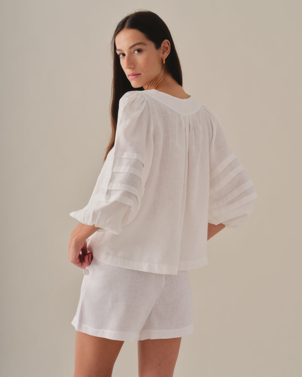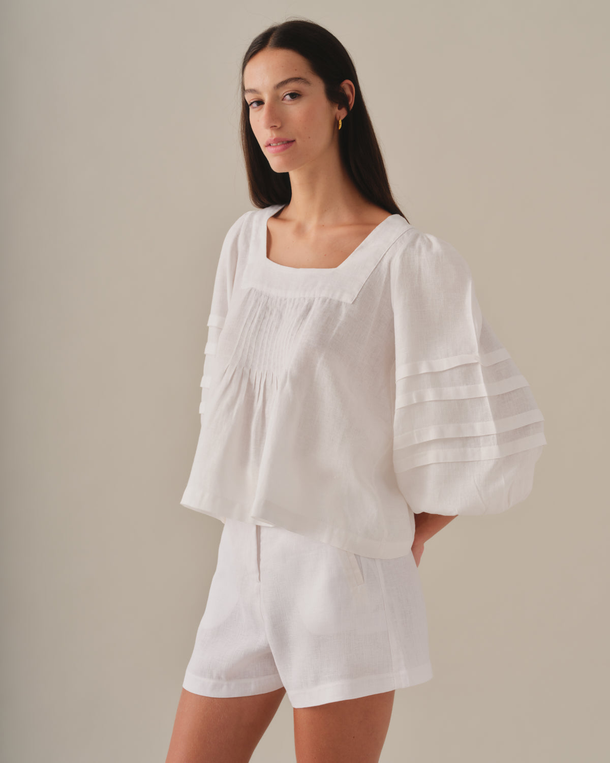 La blouse Mar, confectionnée en lin, présente une coupe décontractée et des manches bouffantes. Légère et respirante, elle est idéale pour le printemps et l'été, apportant une touche féminine aux looks décontractés comme raffinés. Son encolure carrée lui confère un style sexy et polyvalent, idéal en toute occasion.