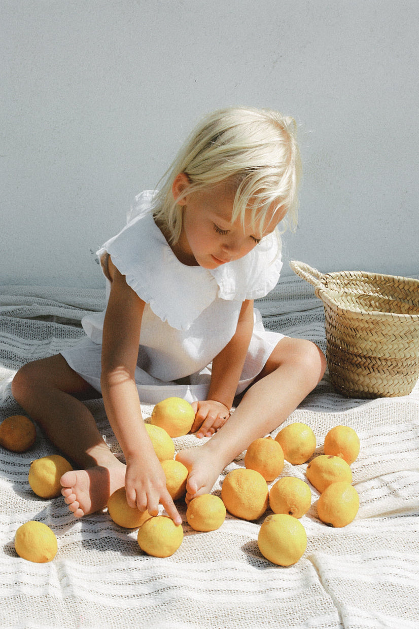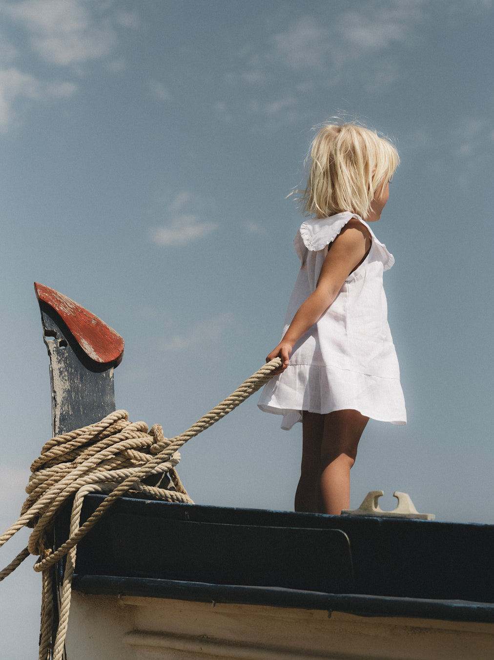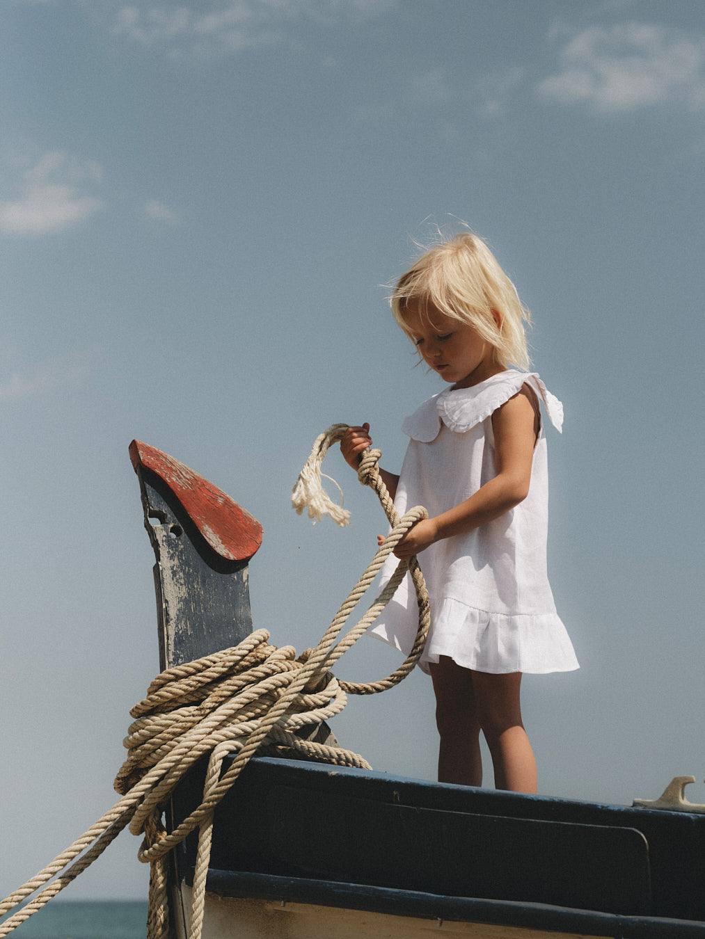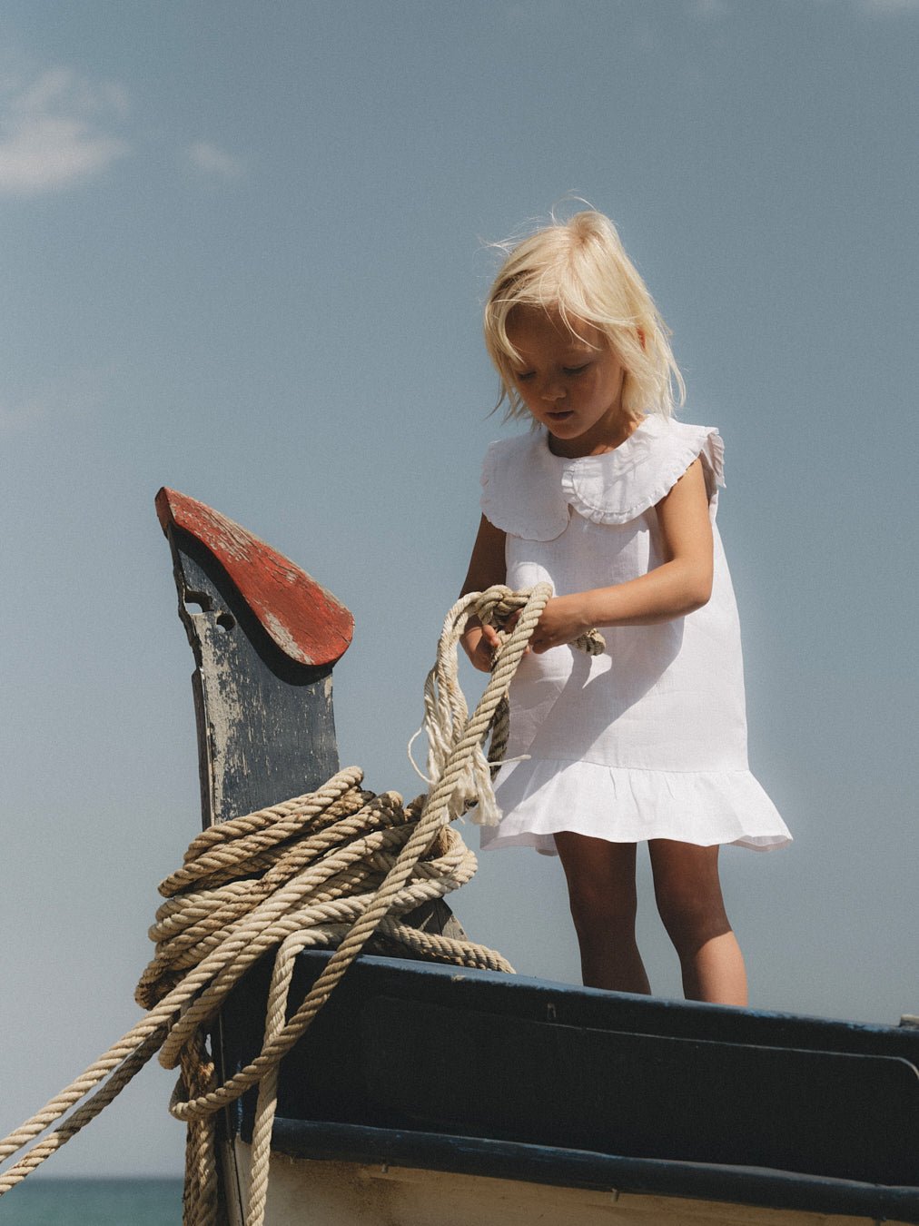 La robe Mina est une robe sans manches, confectionnée en 100 % lin, offrant une coupe respirante et dotée d'un grand col Peter Pan et d'un détail volanté en bas.
