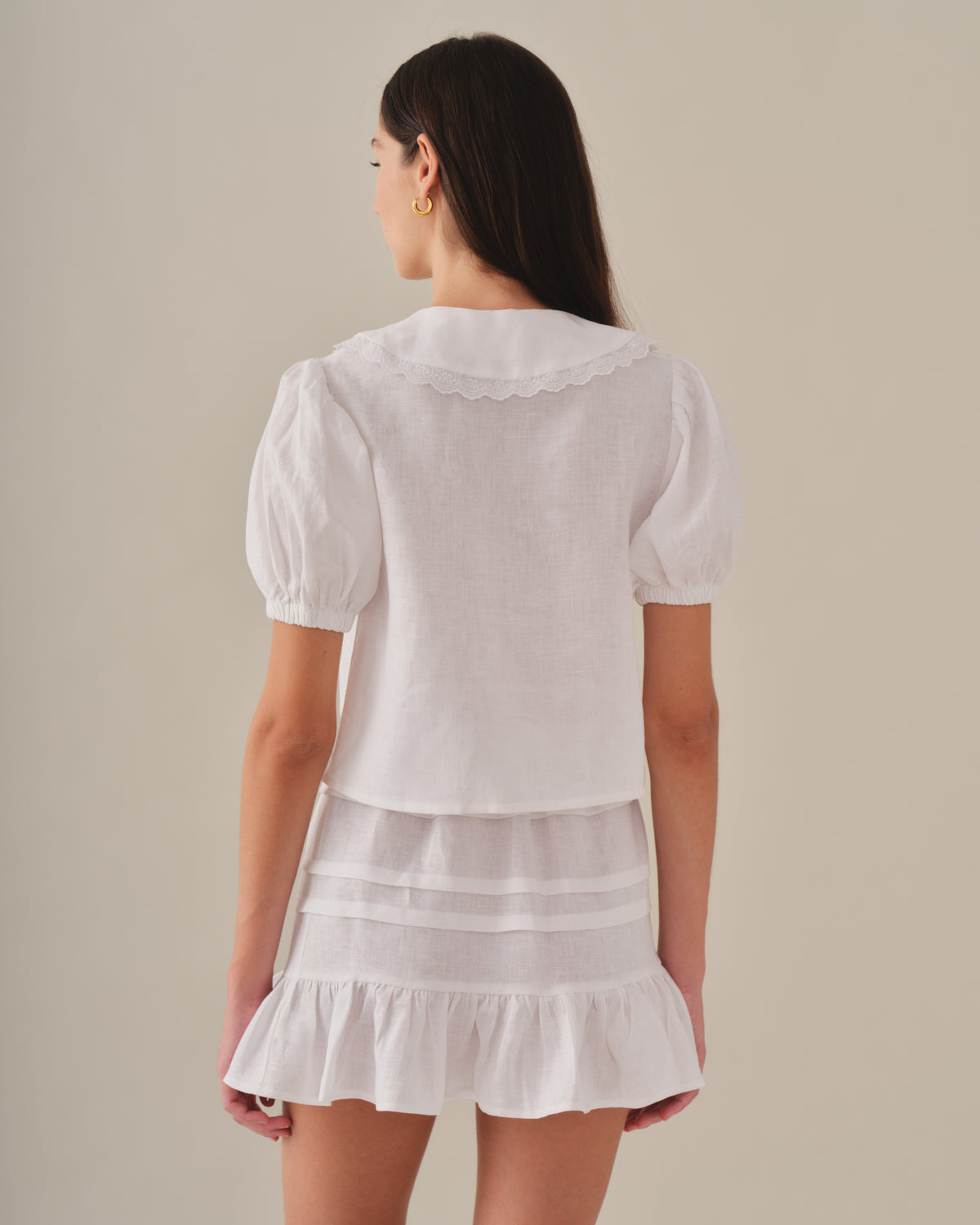 Fabriqué en 100 % lin. ~Jupe courte à coupe ample. ~Ceinture élastique pour un ajustement plus confortable et ajustable. ~Détails plissés et volantés pour ajouter de la texture et de l'originalité. ~Conforme à la taille. ~Le mannequin porte une taille M.