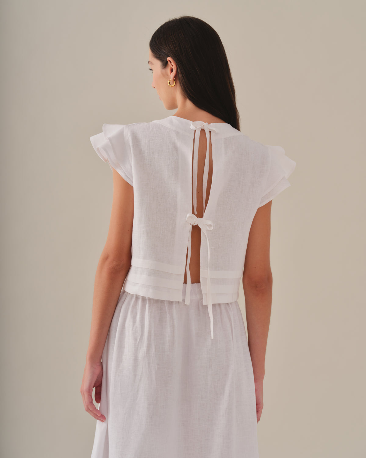 La blouse Camila est un haut légèrement raccourci, avec un dos ouvert et des bretelles réglables pour un confort optimal. Elle est confectionnée en 100 % lin. Les volants sur les manches lui confèrent une touche féminine. Idéale pour votre garde-robe estivale quotidienne.