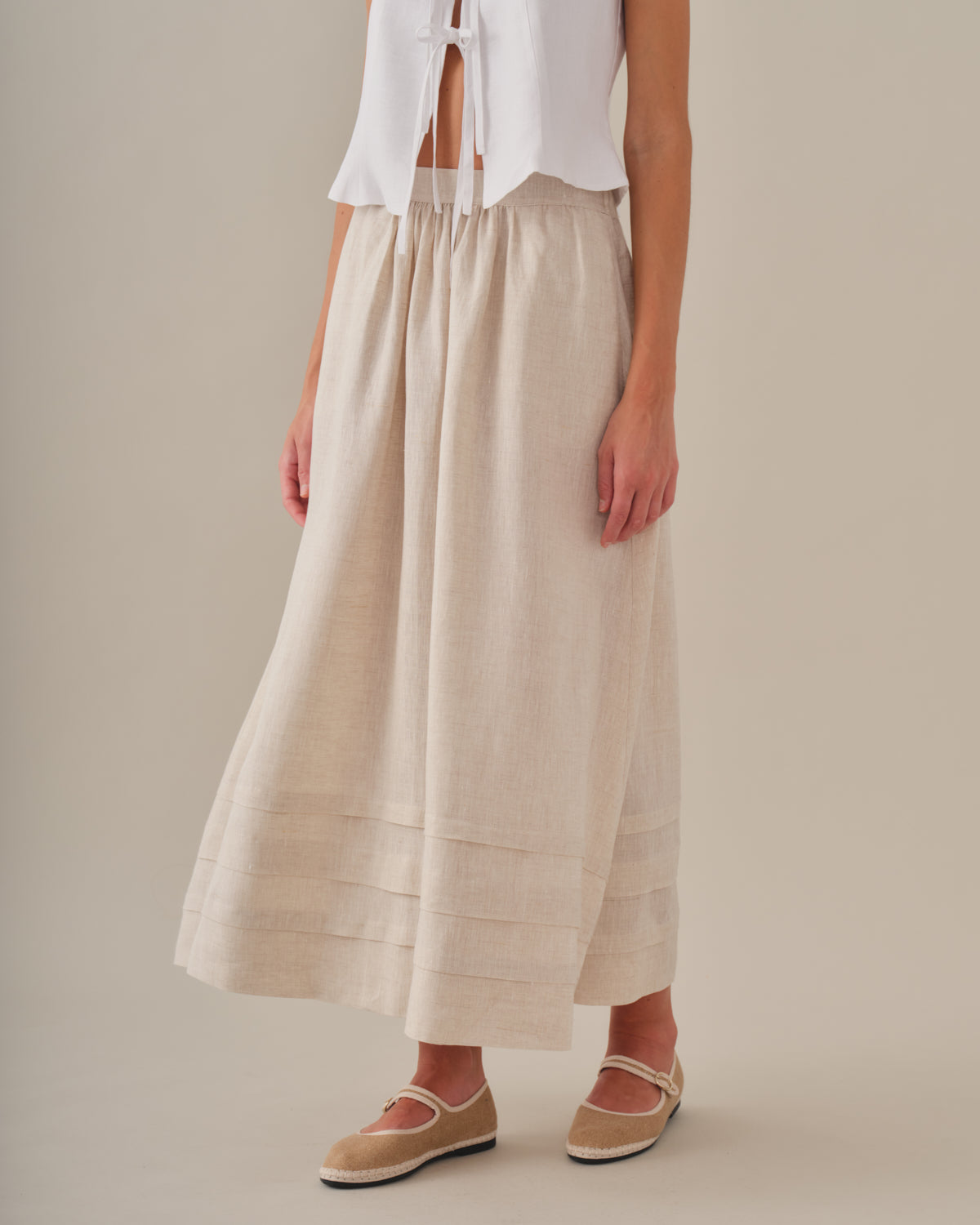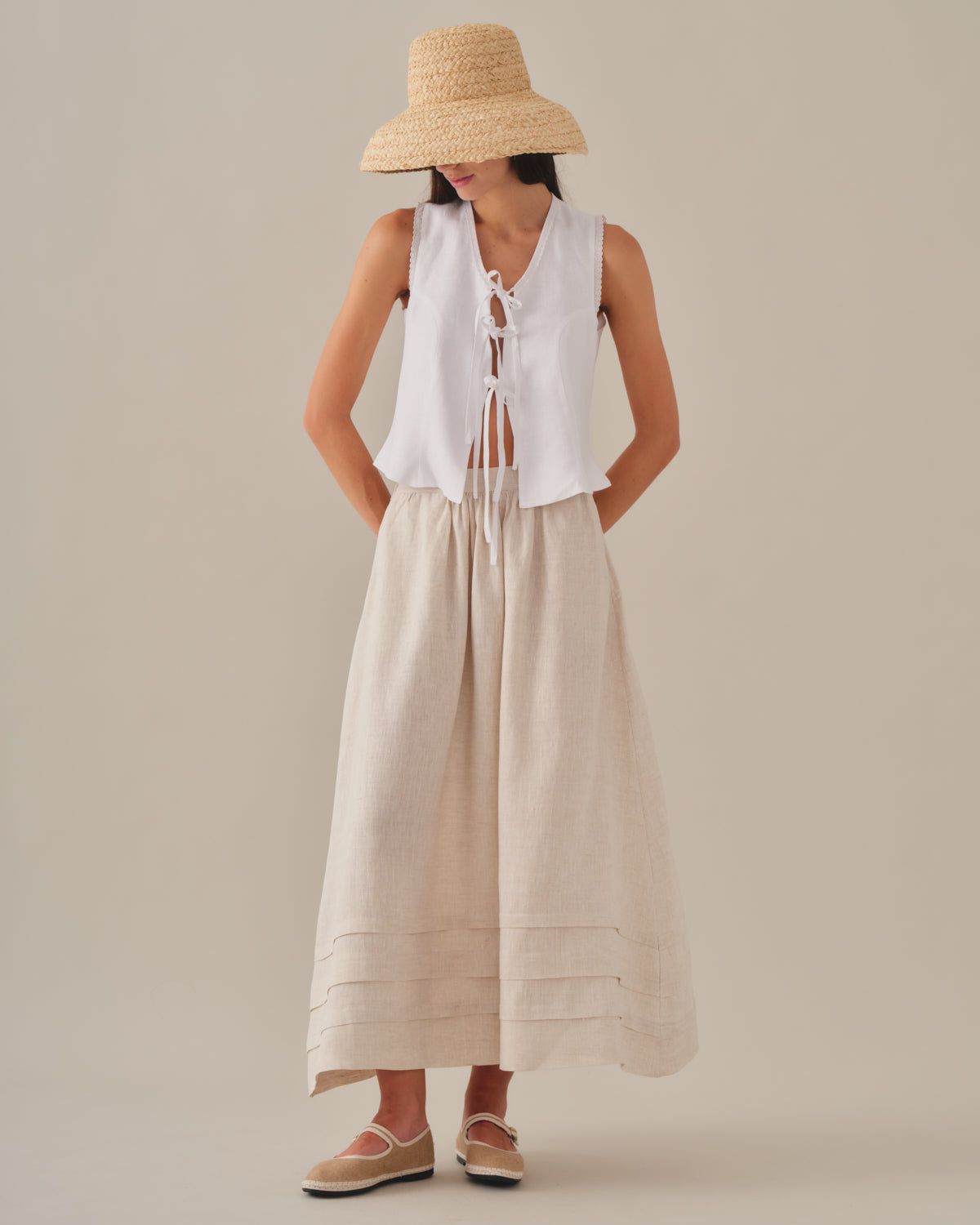 La jupe Marea est une pièce fluide en lin, idéale pour les journées plus chaudes. Avec sa coupe trapèze flatteuse, elle offre une élégance naturelle et une polyvalence idéale pour compléter votre garde-robe estivale.