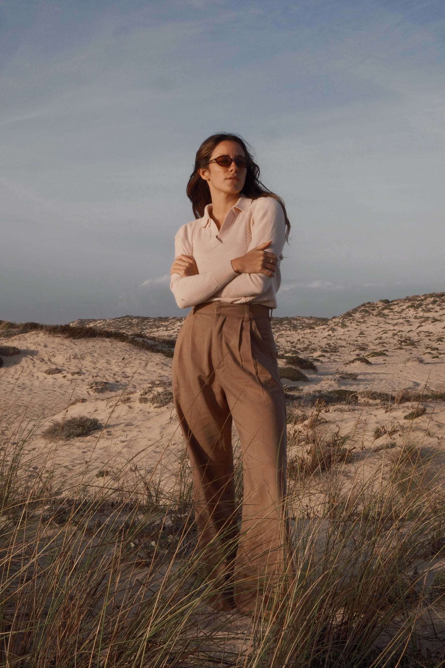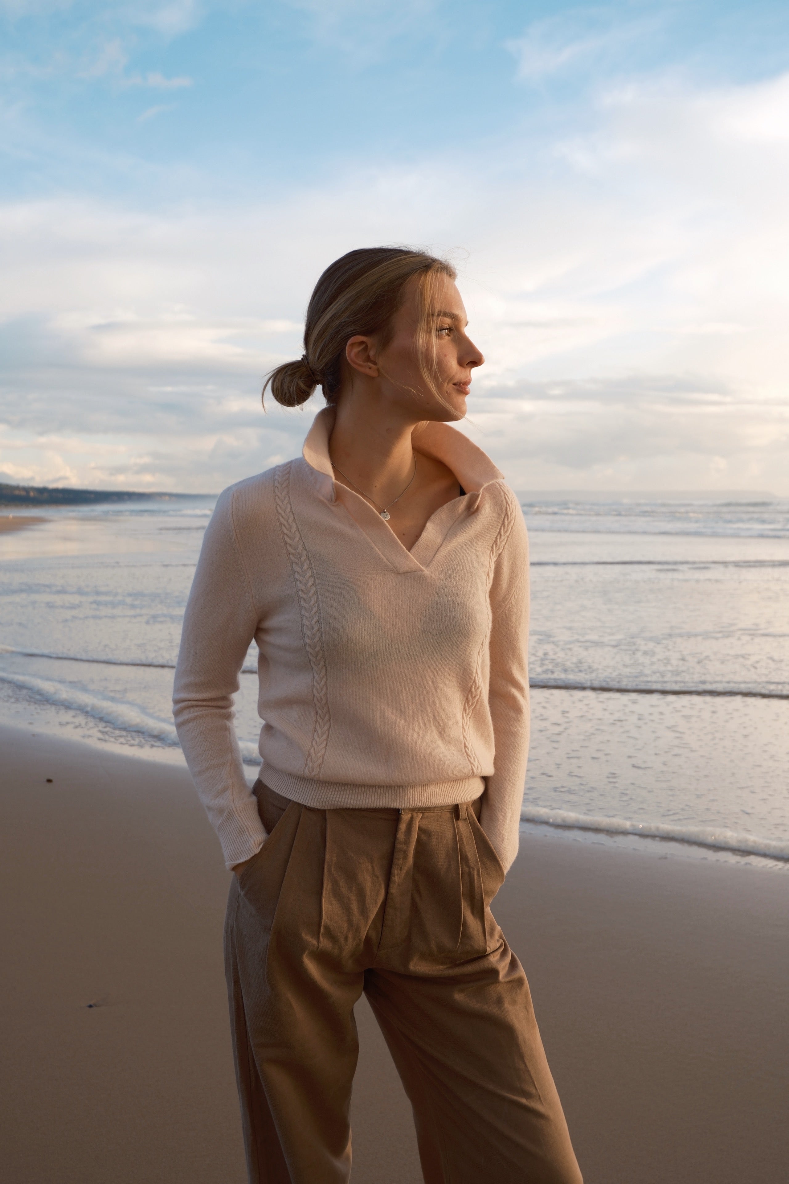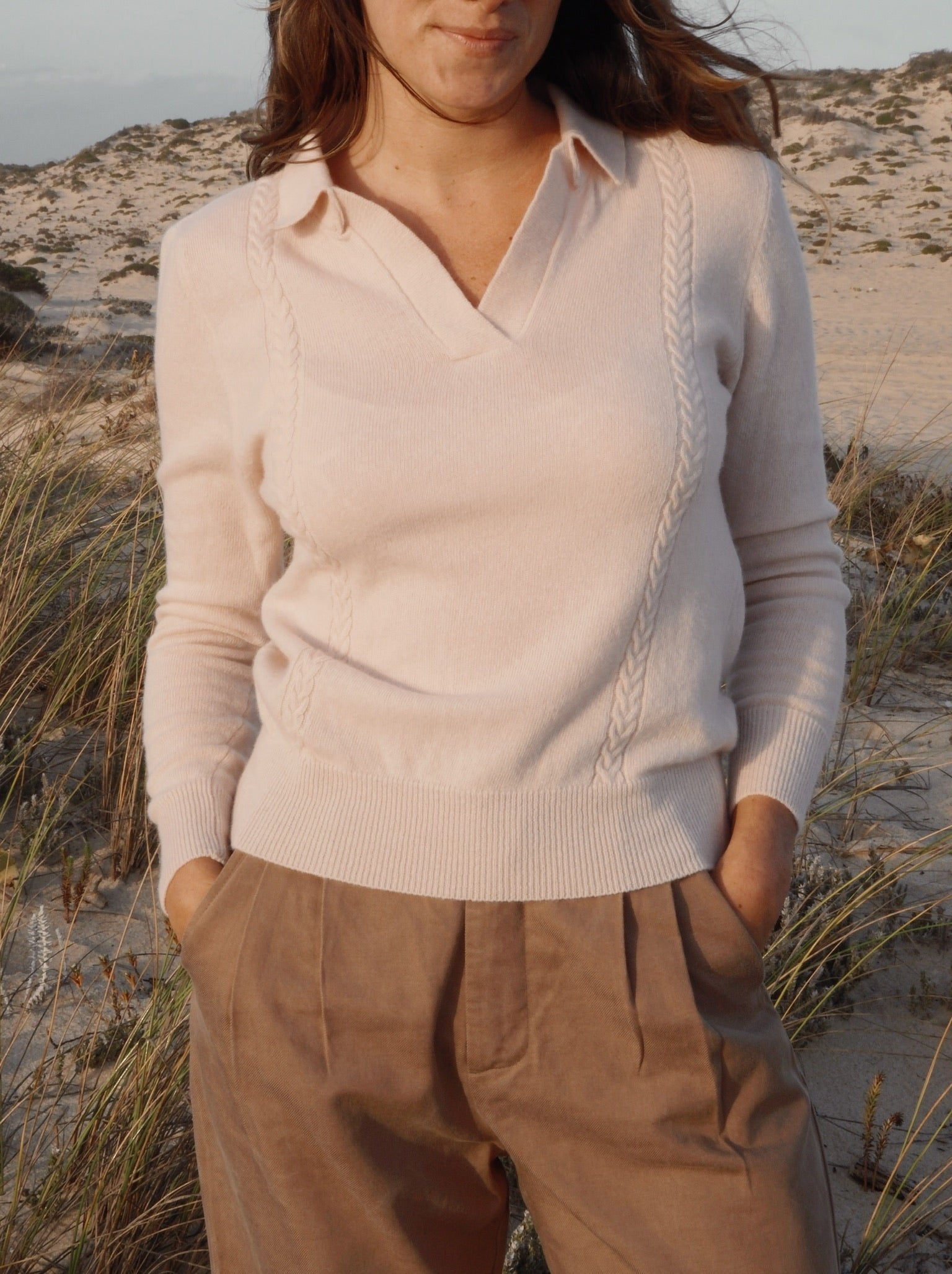 The Sweater Vitto is a lightweight knit which features a soft polo collar and deep V-placket. Vertical cable-knit details run along the bodice, adding texture and length. Finished with ribbed cuffs and waistband.