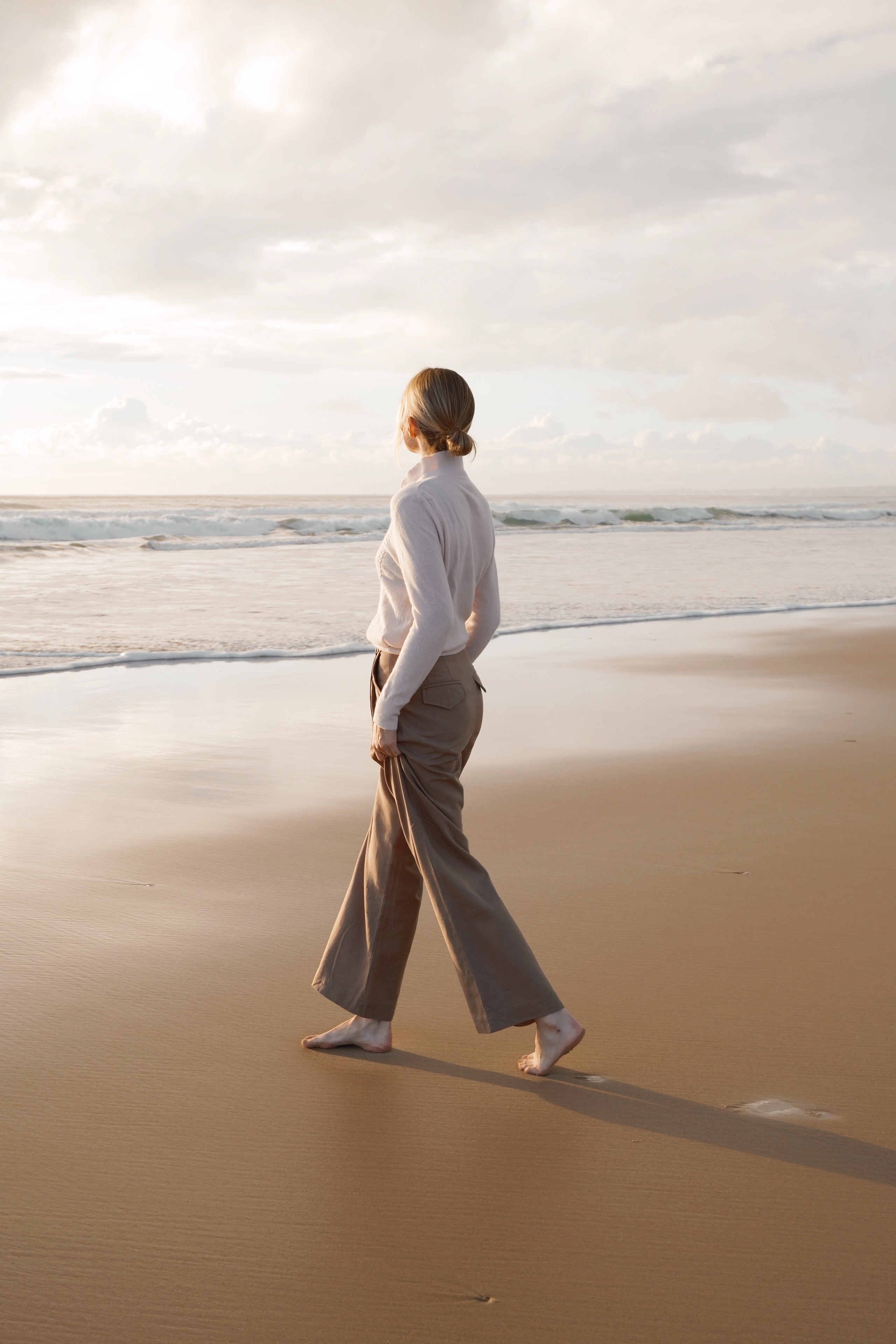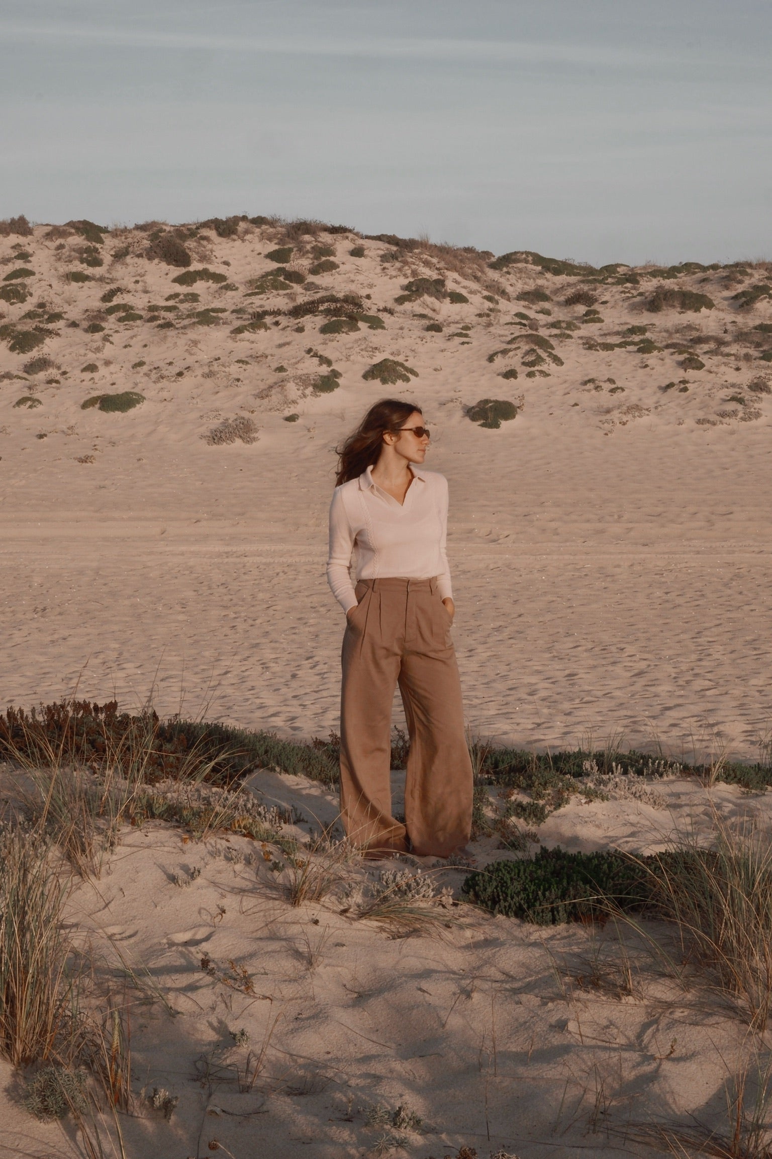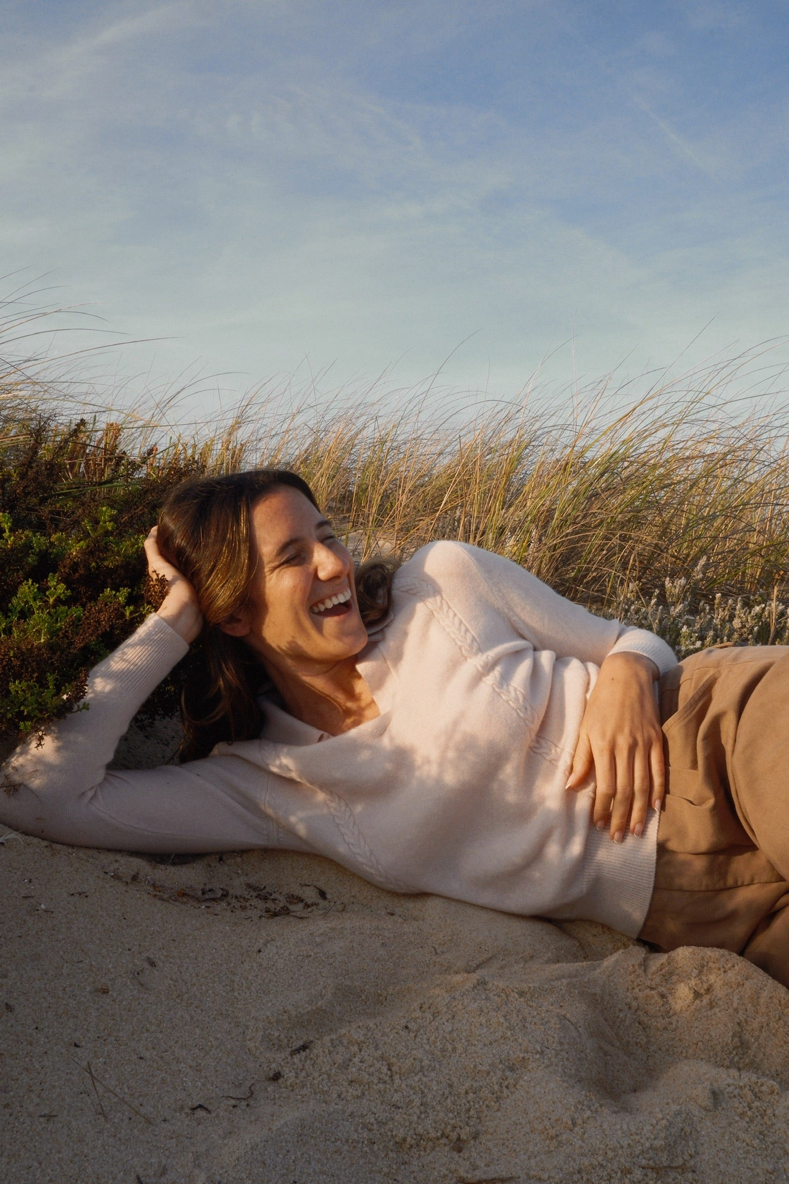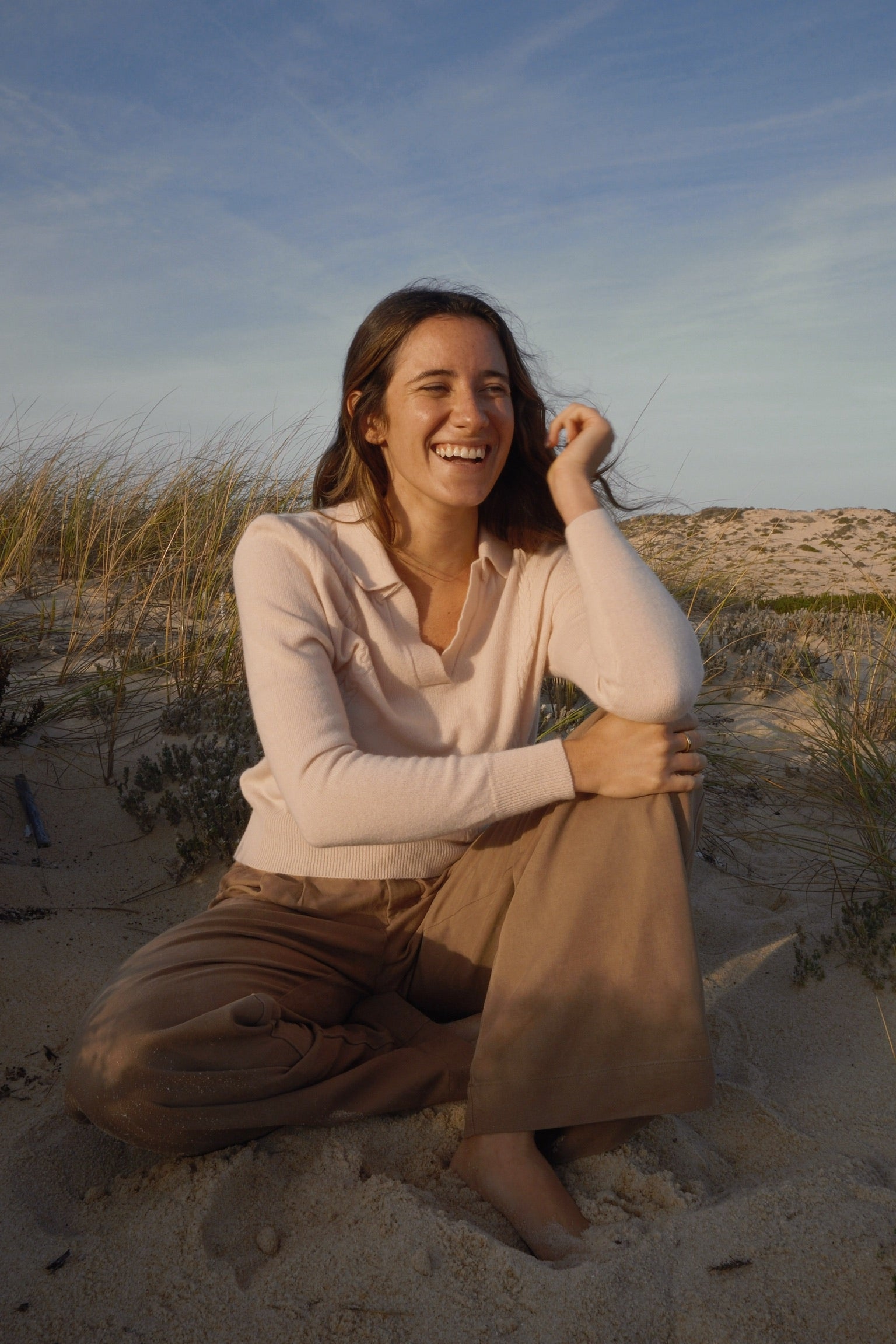 The Sweater Vitto is a lightweight knit which features a soft polo collar and deep V-placket. Vertical cable-knit details run along the bodice, adding texture and length. Finished with ribbed cuffs and waistband.