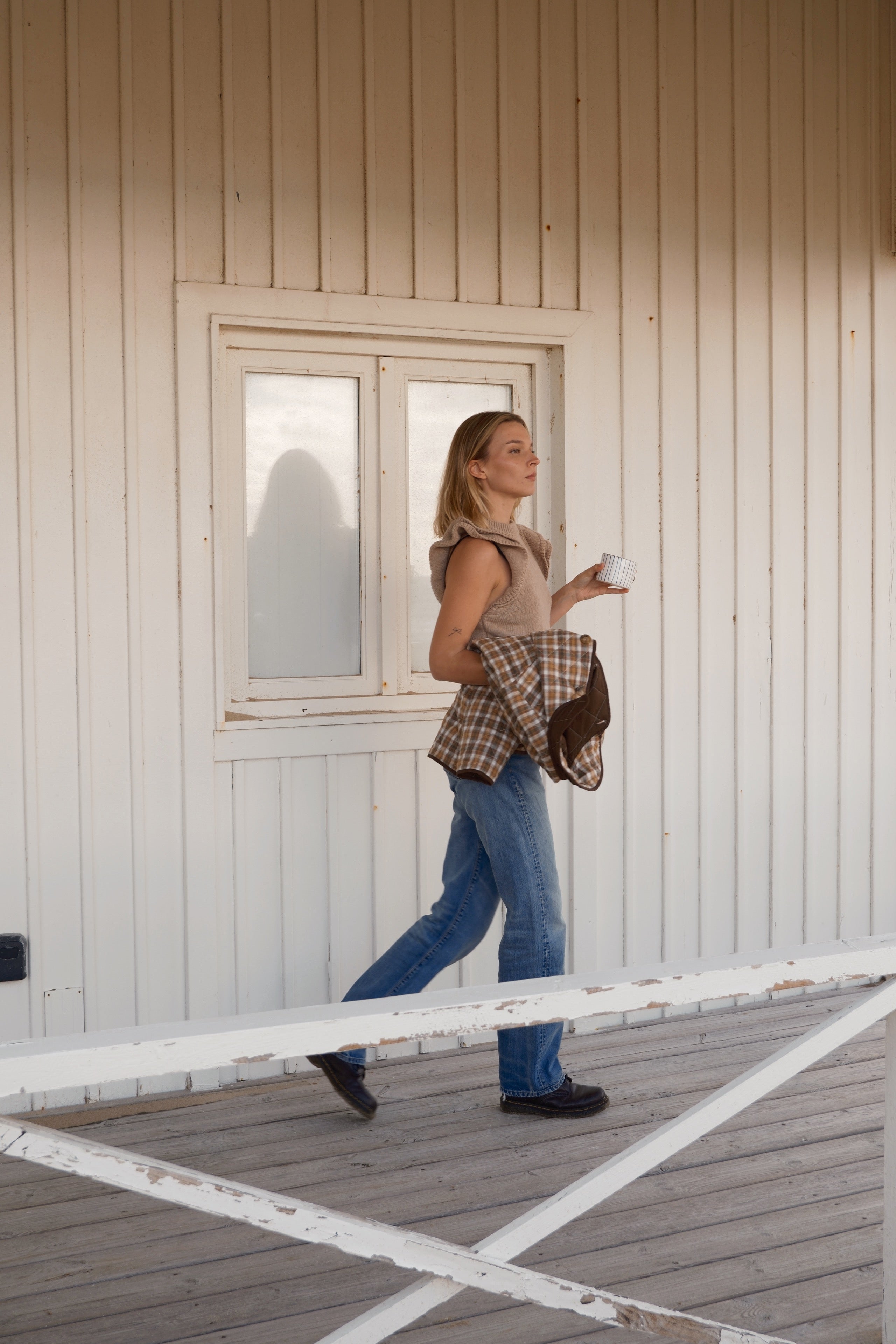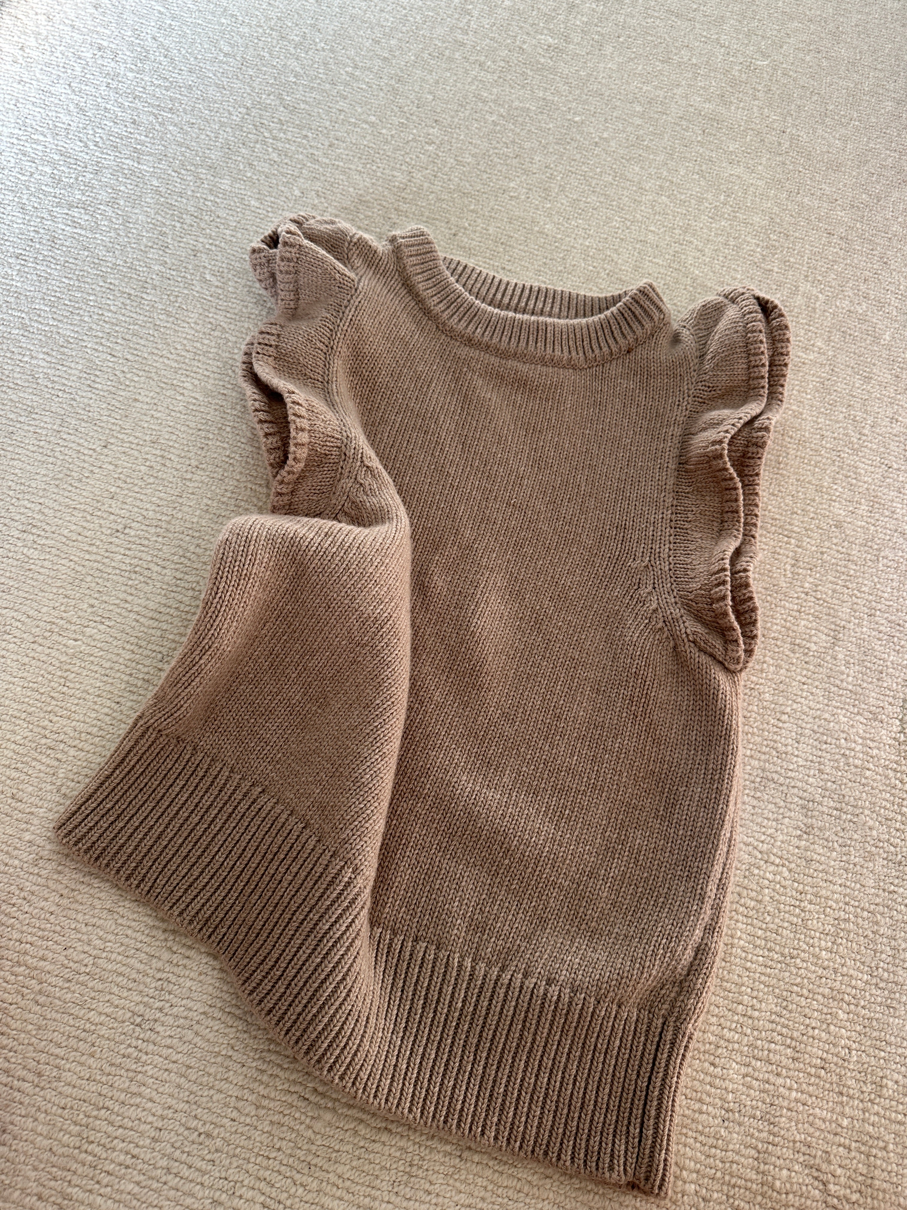 The Vest Grace is a heavyweight knit vest with a romantic twist. It features delicate ruffled sleeves, a round neckline, and a straight, relaxed silhouette finished with a ribbed waistband.